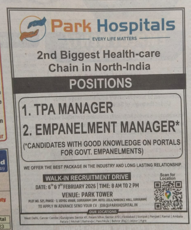 Are you searching for TPA Manager jobs North India or Empanelment Manager vacancies with the best package healthcare chain? This is good opportunity for you. For a get this opportunity you should walk in drive on 6th and 7th February 2026 from 8 am to 2 pm at PARK Tower.